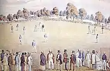 Wills won the match for his side with a top score of 57 not out,[63] and The Age said of his playing style and entertaining ability that "there has not been a more amusing scene on this ground".[64] In the January 1857 intercolonial against New South Wales, held on the Domain in Sydney, Wills was the leading wicket-taker with ten victims, but failed with the bat. Bowling fast round-arm, the Victorians scoffed at the "antiquated" underhand action of their opponents. The latter style proved effective, however, giving New South Wales a 65-run win.[65] Back in Victoria, Wills joined numerous clubs, including the provincial Corio Cricket Club, based in Geelong, and the elite Melbourne Cricket Club (MCC).[66] Although he had a greater affinity for Corio, the MCC maintained that Wills belonged to them, and took offence at his lack of loyalty to any one club.[67] In order to secure Wills in matches between the two teams, the MCC allowed Corio to field an extra five men to make up for his loss.[68]