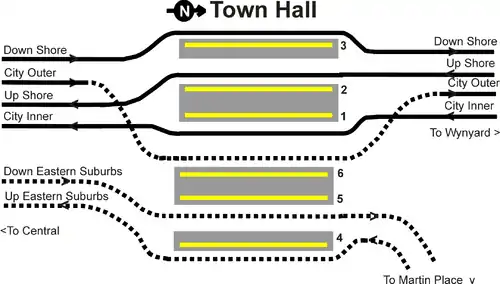 Town Hall has two platform levels, each with three platforms – physically two island platforms, but set up so that one faces two tracks and the other faces the other track. Each platform has one lift in the centre connecting the concourse with the platforms, providing Easy Access for wheelchairs. These facilities were constructed in 1999. The lower-level platforms (4 to 6) have 4 escalators to the concourse. As the platform is not wide enough, the escalators are in a cross configuration, with two at either end of the platform and another two at the centre. The escalator directions can be changed by staff throughout the day as the passenger flow dictates. The upper-level platforms have stairs up to the concourse. There are also small staircases linking the two platform levels.
