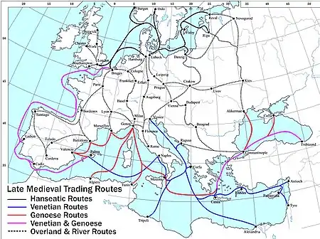Western Europe established a complex and expansive trade network with cargo ships being the main carrier of goods; Cogs and Hulks are two examples of such cargo ships.[62] Many ports would develop their own extensive trade networks. The English port city of Bristol traded with peoples from what is modern day Iceland, all along the western coast of France, and down to what is now Spain.[63]