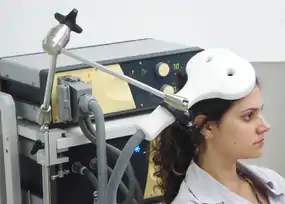 During the procedure, a magnetic coil is positioned at the head of the person receiving the treatment using anatomical landmarks on the skull, in particular the inion and nasion.[13] The coil is then connected to a pulse generator, or stimulator, that delivers electric current to the coil.[2]