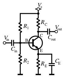 The common-emitter amplifier is designed so that a small change in voltage (Vin) changes the small current through the base of the transistor whose current amplification combined with the properties of the circuit means that small swings in Vin produce large changes in Vout.[78]