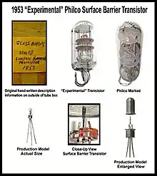 The first high-frequency transistor was the surface-barrier germanium transistor developed by Philco in 1953, capable of operating at frequencies up to 60 MHz.[30] They were made by etching depressions into an n-type germanium base from both sides with jets of Indium(III) sulfate until it was a few ten-thousandths of an inch thick. Indium electroplated into the depressions formed the collector and emitter.[31][32]