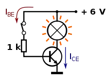 The use of bipolar transistors for switching applications requires biasing the transistor so that it operates between its cut-off region in the off-state and the saturation region (on). This requires sufficient base drive current. As the transistor provides current gain, it facilitates the switching of a relatively large current in the collector by a much smaller current into the base terminal. The ratio of these currents varies depending on the type of transistor, and even for a particular type, varies depending on the collector current. In the example of a light-switch circuit, as shown, the resistor is chosen to provide enough base current to ensure the transistor is saturated.[78] The base resistor value is calculated from the supply voltage, transistor C-E junction voltage drop, collector current, and amplification factor beta.[80]
