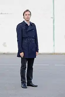 A man wearing a short navy blue–coloured trenchcoat (2018)