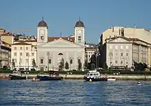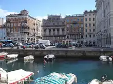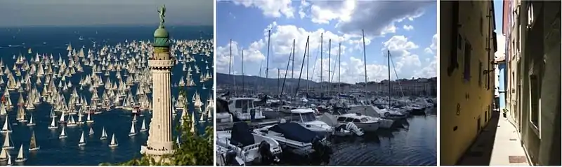 Clockwise from top: Piazza Unità d'Italia; Serbian Orthodox church; Castello Miramare; the city seafront seen from the Molo Audace; a narrow street of the Old City; and the Canal Grande ("Grand Canal") | |