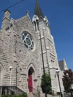 The original building was demolished in 1873 and replaced by the current Romanesque-style building, which was completed in 1877 and is faced with rough-cut gray stone.[2][3] The rectory was built in 1883 and a parish house was added in 1916. Renovations in the 1920s and 1980s maintained the historic integrity of the original design.[2]