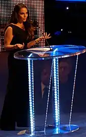 On June 3, 2006, she hosted the Canada's Walk of Fame induction ceremony and performed a song and dance number inspired by the soundtrack from the film Chicago at the event.[163][164] During the show, Stratus ad libbed a kiss with fellow Canadian actress Pamela Anderson.[80][163][165]