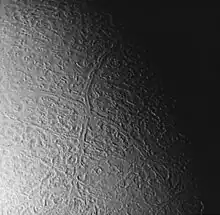 There are extensive ridges and valleys in complex patterns across Triton's surface, probably the result of freeze–thaw cycles.[69] Many also appear to be tectonic and may result from an extension or strike-slip faulting.[70] There are long double ridges of ice with central troughs bearing a strong resemblance to Europan lineae (although they have a larger scale[14]), and which may have a similar origin,[7] possibly shear heating from strike-slip motion along faults caused by diurnal tidal stresses experienced before Triton's orbit was fully circularized.[14] These faults with parallel ridges expelled from the interior cross complex terrain with valleys in the equatorial region. The ridges and furrows, or sulci, such as Yasu Sulci, Ho Sulci, and Lo Sulci,[71] are thought to be of intermediate age in Triton's geological history, and in many cases to have formed concurrently. They tend to be clustered in groups or "packets".[70]