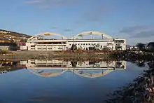 The airport was situated at Skattøra in what was then Tromsøysund Municipality, in today's Tromsø, some 6 kilometers (3.7 mi) north of the city center.[3] The predominant structure at the airport was the twin hangar building. It consists of two concrete arch triplets which carry the roof. Inside the hangar is split in two with a reinforced wall. The structure measures 2,000 square meters (22,000 sq ft).[40] There were two slipways, one falling down from the hangar and one further north.[44] There was a 63-meter (207 ft) pier which ran out from the airport, with a small building at the end.[45] A reinforced wall was built to protect aircraft from attack.[41]