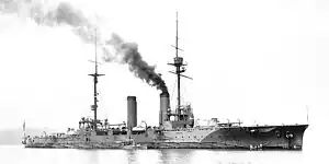 Possibly due to the speed at which she was constructed, Tsukuba reportedly suffered from numerous defects.[9] Shortly after she was completed, the ship sailed for America where she participated in the Jamestown Exposition Naval Review in May–June 1907.[27] The ship then sailed to Europe where she made numerous port visits over the next several months.[28][29] While in Britain, Tsukuba was fitted with a Vickers fire-control system that calculated the firing data for each gun and with which the gunnery officer fired the guns in unison.[18] Ikoma visited England in July 1910 as part of the Japan–British Exhibition.[30]