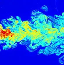 Flow visualization of a turbulent jet, made by laser-induced fluorescence. The jet exhibits a wide range of length scales, an important characteristic of turbulent flows.