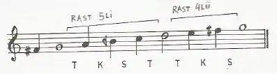 This much-used makam—which is said to bring happiness and tranquility to the hearer—consists of a Rast pentachord plus a Rast tetrachord on the note Neva (D); this is labeled (1) below. The tonic is G (Rast), the dominant D (Neva), and the leading tone F-sharp (Irak). However, when descending from the octave towards the tonic, the leading tone is always flattened 4 commas to the note Acem (F), and thus a Bûselik tetrachord replaces the Rast tetrachord; this is labeled (2) below. Additionally, there is a development (genişleme) in the makam's lower register, below the tonic, which consists of a Rast tetrachord on the note D (Yegâh); this is labeled (1A) below.