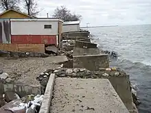 Twin Lakes Beach has been the recipient of many storms causing shoreline erosion, flooding and property damage. Most notably are the storms of the fall of 1999, especially the storm on November 1 , as well as the fall of 2010 "weather bomb" both of which involved wind gusts of over 100 km/h and high winds for an extended period of time with the result being a shift in the lake of water from the north basin of Lake Manitoba to the south basin of the lake and large waves. Both storms resulted in considerable shoreline erosion, property damage, and some flooding. The 1999 storm caused an estimated $1 million in damage and was a catalyst for establishing new regulation of lake levels.[5] Also in 1981 and 1992 cottages were destroyed as a result of shoreline ice pile-up. On July 29, 2012 a thunderstorm occurred at Twin Lakes Beach causing widespread damage to property including complete destruction of homes due to heavy rain, hail, and plow winds with gusts up to 150 km/h recorded on radar.[16][17]