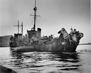 On 3 May 1944, at 0118 hours, Menges was 15½ miles astern of the convoy chasing down a radar contact when she was hit by a G7es acoustic torpedo from U-371 (which was in turn sunk the next day by USS Joseph E. Campbell, USS Pride and other warships). The explosion was so violent that the aft third of the ship was destroyed, killing 31 men and wounding 25. However, Commander McCabe refused to give the order to abandon ship as long as there was chance of saving her. In addition, several of the crew members heroically jumped astride torpedoes loosened in the blast to disarm them. Menges, thanks to such creditable action, remained afloat.