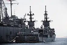 The Knox-class ships were armed with a 5"/54 caliber Mark 42 gun forward and a single 3-inch/50-caliber gun aft. They mounted an eight-round ASROC launcher between the 5-inch (127 mm) gun and the bridge. Close-range anti-submarine defense was provided by two twin 12.75-inch (324 mm) Mk 32 torpedo tubes. The ships were equipped with a torpedo-carrying DASH drone helicopter; its telescoping hangar and landing pad were positioned amidships aft of the mack. Beginning in the 1970s, the DASH was replaced by a SH-2 Seasprite LAMPS I helicopter and the hangar and landing deck were accordingly enlarged. Most ships also had the 3-inch (76 mm) gun replaced by an eight-cell BPDMS missile launcher in the early 1970s.[3]
