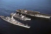 The ships departed again on 14 March for another round of air strikes on Japan.[24] Four days later, Missouri's anti-aircraft guns assisted in the destruction of four Japanese aircraft. American carrier aircraft struck a variety of targets around the Inland Sea, which prompted a Japanese counter-attack that struck several carriers. The carrier Franklin was badly damaged and Missouri's task group was detached to cover her withdrawal. By 22 March, Franklin had left the area of operations and the group returned to the fleet to join the preparatory bombardment for the upcoming invasion of Okinawa.[16] Missouri was temporarily transferred to TF 59, along with her sisters New Jersey and Wisconsin, to bombard the southern coast of Okinawa on 24 March,[25] part of an effort to draw Japanese attention from the actual invasion target on the western side of the island, during which she fired 180 rounds. Missouri thereafter returned to TG 58.4.[26]