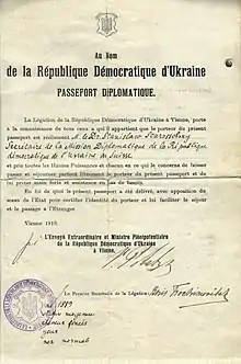 1919 Ukraine People's Republic Diplomatic passport issued for serving in Switzerland