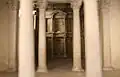 The Ulpian Library continued in the tradition of Roman imperial libraries with Latin and Greek collections housed separately. In this library, they faced one another across a small colonnaded courtyard that enclosed the Column of Trajan.[10] The library was a two level structure with high vaulted ceilings to take advantage of the natural lighting. The interior walls were divided into bays by columns "set opposite pilasters that framed the niches which held the books and scrolls. There were three steps between the columns that enabled "access to a walkway in front of the bookcases."[11] At the other end of the hall were recesses for a statue on each level, presumably of Trajan and possibly of Minerva. The niches (seven total on each wall) containing recessed wooden bookcases located in both walls running the length of the library along with four others running across the back wall stored the scrolls. Estimates on the amount of scrolls held are "approximately ten thousand" for both Latin and Greek libraries. "In addition, there were archival materials, such as praetorian edicts and senatorial decrees, as well as Caesar's autobiography and Trajan's commentaries on the Dacian Wars, of which now only a few words survive."[12] The space itself was designed to be aesthetically pleasing with desks (plutei) and the books out of sight on shelves and intending for reading, but was not designed with the growth of the collection in mind.