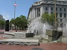 The fountain in UN Plaza was designed by Lawrence Halprin in collaboration with Ernest Born and completed in 1975.[5]:4–68 [21][36] The granite slabs are intended to symbolize the continents of Earth, and the lowest central block symbolizes a mythical lost continent. The original design called for water to flood and drain from the basin on a two-minute cycle to simulate the ocean's tides. Aerial jets make the fountain's location visible from the street, and also alert spectators to the start of a new flood/drain cycle.[5]:4–68 [11] Computer-controlled features were intended to detect wind and attenuate pump output accordingly, to avoid splashing passers-by.[15] The fountain never worked as designed and was fenced off as early as 1978.[37]
