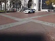 In the original design, UN Plaza features included 117,000 sq ft (10,900 m2) of brick paving, laid in a herringbone pattern, and 20,000 sq ft (1,900 m2) of grass lawn.[11] The paving in the southwest part of UN Plaza, near the border with Market Street, is interrupted by a cross formed by granite blocks inlaid with brass which indicate the coordinates of San Francisco used to measure distances to other cities.[5]:4–67 It is built on the former site of the City Hall that was destroyed in the 1906 earthquake.[14] The pedestrian promenade along the Fulton alignment was lit with 16 light standards and featured 24 wood slat benches along the outer edges along with 192 London plane and black poplar trees. As mentioned above, the focal point was intended to be a large fountain executed in granite slabwork.[11] The design of UN Plaza is credited to the landscape architecture firm of Halprin & Associates, with Don Carter as principal-in-charge, and Angela Danadjieva (who later served as lead designer for Freeway Park in Seattle) as the landscape architect.[15][16]