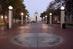 UN Plaza features the emblem of the United Nations and a view of San Francisco City Hall, looking west (2010)