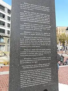 In 1995, for the 50th anniversary of the United Nations, a "Walk of Great Ideas", funded with private donations, was added to the plaza at a cost of US$400,000 (equivalent to $770,000 in 2022).[18] The Walk consisted of eight white granite paving stones inlaid with the preamble to the UN Charter in brass, matching the style of the coordinates cross in the southwest part of the plaza.[5]:4–81 Additional updates in 1995 included inscribing a list of UN member nations on the light standards, adding the UN emblem to the center of the plaza, engraving the preamble to the Universal Declaration of Human Rights on an existing 17-foot (5.2 m) tall black granite obelisk, and updating the lighting fixtures.[11][18][19] The original luminaires were semi-translucent and square, matching the shape of the columns; the updated fixtures (which remain today) are frosted glass globes.[5]:5–33