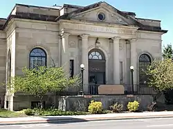Built in 1913 of brick with an asphalt roof, the post office features substantial amounts of sandstone.[2] Its design, produced under the direction of Oscar Wenderoth, combines prominent elements of two common architectural styles of the early twentieth century. The arched windows display the influence of the Neo-Renaissance style, as do the side quoins and certain details of the portico. Meanwhile, the overall appearance of the facade is clearly Neoclassical, due to details in the portico, the architect's choice of smooth stone for the exterior walls, and the generally symmetrical appearance.[3] One large window sits on either side of the main entrance, which is covered by a four-column portico; the pediment at the top of the portico features a central oculus.[2] The main entrance features a fanlight, an iron frame, and elements in the Corinthian order.[4]