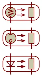 European-style schematics of resistive opto-isolators that use an incandescent bulb (top), a neon lamp (middle) or a light-emitting diode (bottom).