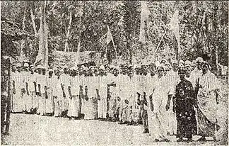 ![]() Leaders of Vaikom Satyagraha including T. K. Madhavan (sitting : middle row, last as one views the photograph) K. Kumar (standing last in the row behind TK Madhavan : bearded) K. P. Kesava Menon (sitting, third) and Amachadi Thevan . | |