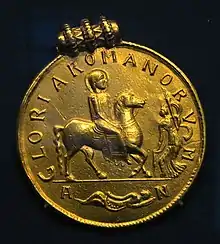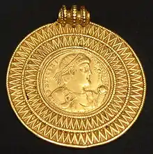 - ↑ From the fourth century onwards, emperors and other high-profile men bore the name "Flavius", the nomen adopted by the Constantinian dynasty. It was used only as a status marker,[3] but it's still often included as part of late emperors' names.[4]