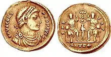 Valens's elder brother Valentinian also joined the protectores, rising to tribunus in 357;[17] he served in Gaul and in Mesopotamia during the reign of Constantius II (r. 337–361).[17] According to the Chronicle of Jerome and the Chronicon Paschale, Valens's eldest nephew Gratian was born in 359 at Sirmium (Sremska Mitrovica) to Valentinian's wife Marina Severa.[19][20]