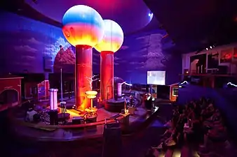 The largest air-insulated Van de Graaff generator in the world, built by Dr. Van de Graaff in the 1930s, is now displayed permanently at Boston's Museum of Science. With two conjoined 4.5 m (15 ft) aluminium spheres standing on columns 22 ft (6.7 m) tall, this generator can often obtain 2 MV (2 million volts). Shows using the Van de Graaff generator and several Tesla coils are conducted two to three times a day.[25] Many science museums, such as the American Museum of Science and Energy, have small-scale Van de Graaff generators on display, and exploit their static-producing qualities to create "lightning" or make people's hair stand up. Van de Graaff generators are also used in schools and science shows.[26]