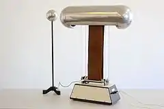 A Van de Graaff generator is an electrostatic generator which uses a moving belt to accumulate electric charge on a hollow metal globe on the top of an insulated column, creating very high electric potentials. It produces very high voltage direct current (DC) electricity at low current levels. It was invented by American physicist Robert J. Van de Graaff in 1929.[1] The potential difference achieved by modern Van de Graaff generators can be as much as 5 megavolts. A tabletop version can produce on the order of 100 kV and can store enough energy to produce visible electric sparks. Small Van de Graaff machines are produced for entertainment, and for physics education to teach electrostatics; larger ones are displayed in some science museums.