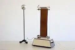 Large metal sphere supported on a clear plastic column, inside of which a rubber belt can be seen clearly: A smaller sphere is supported on a metal rod. Both are mounted to a base plate, on which is a small driving electric motor.
