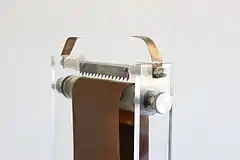 The concept of an electrostatic generator in which charge is mechanically transported in small amounts into the interior of a high-voltage electrode originated with the Kelvin water dropper, invented in 1867 by William Thomson (Lord Kelvin),[3] in which charged drops of water fall into a bucket with the same polarity charge, adding to the charge.[4] In a machine of this type, the gravitational force moves the drops against the opposing electrostatic field of the bucket. Kelvin himself first suggested using a belt to carry the charge instead of water. The first electrostatic machine that used an endless belt to transport charge was constructed in 1872 by Augusto Righi.[1][4] It used an india rubber belt with wire rings along its length as charge carriers, which passed into a spherical metal electrode. The charge was applied to the belt from the grounded lower roller by electrostatic induction using a charged plate. John Gray also invented a belt machine about 1890.[4] Another more complicated belt machine was invented in 1903 by Juan Burboa[1][5] A more immediate inspiration for Van de Graaff was a generator W. F. G. Swann was developing in the 1920s in which charge was transported to an electrode by falling metal balls, thus returning to the principle of the Kelvin water dropper.[1][6]