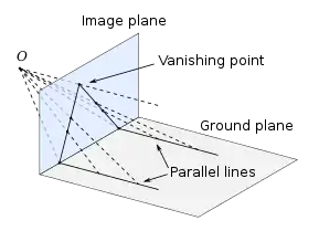 A vanishing point is a point on the image plane of a perspective rendering where the two-dimensional perspective projections of mutually parallel lines in three-dimensional space appear to converge. When the set of parallel lines is perpendicular to a picture plane, the construction is known as one-point perspective, and their vanishing point corresponds to the oculus, or "eye point", from which the image should be viewed for correct perspective geometry.[1] Traditional linear drawings use objects with one to three sets of parallels, defining one to three vanishing points.