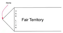 Over-the-line (OTL) is a variation requiring only three players per team, and is played without gloves in some gender/age divisions. The batter stands at the point of a triangle, with his goal being to hit the ball (pitched by a teammate) over the opposing line of the triangle without the ball being caught by a defender. The fair territory is designated by two parallel lines emanating at right angles from the two corners of the triangle away from the batter. There is no baserunning, with runs scored when there are either 3+ "base hits" (uncaught fair balls) in an inning, or a "home run" (a ball landing past the furthest fielder).[44]
