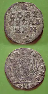 The currency of the islands during Venetian rule was the Venetian lira, as in Venice.[89] There was a special issue for the Islands; the obverse side of it has the complete or shortened inscription CORFU/CEFALONIA/ZANTE in three lines. The reserve depicts the winged and haloed lion of Saint Marc in a front view, holding the book of the Gospel in his fore-paws.[90] The Ionian Islands formed part of the Venetian maritime trade route to the Orient.[91]