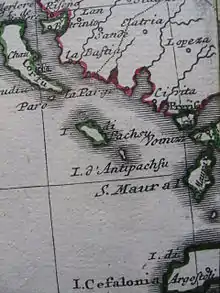 ![]() The Ionian Islands in green. Map of 1785, when the Islands were still part of the Venetian Republic. | |||||||||
