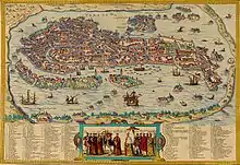 On 13 February 1386 Corfu became once more a Venetian possession and this time Venetian rule would last until the end of the Republic.[33] This was accomplished voluntarily by the people of Corfu.[34] On 10 May, the Corfiotes appointed five ambassadors to submit to the Venetian senate.[33] The Ottomans made several attempts to capture Corfu, the first of which was in 1537.[35] This attack led Venice to an alliance with the Pope and Emperor Charles V, known as the Holy League, against the Ottoman Empire.[36] Another major unsuccessful Ottoman attack was that of July 1716.[37]