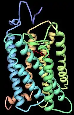Three-dimensional structure of bovine rhodopsin. The seven transmembrane domains are shown in varying colors. The retinal chromophore is shown in red.