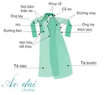 Vietnamese wore a round neck costume, which was made from 4 parts of cloth called áo tứ điên.[8] Both men and women wore it. There are also other types such as: áo tràng vạt (long-flap robe). The garments "áo" (áo is for the upper part of body) are below knee length, and round neck garments have buttons when the long-flap robe is tied to the right.