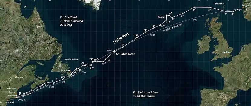 Viking sailed to North America, via Newfoundland and New York, up the Hudson River, through the Erie Canal and into the Great Lakes to Chicago, where the World's Columbian Exposition was taking place in 1893 to commemorate the discovery of America by Columbus. Carter Harrison, Sr., Chicago's four-term mayor, boarded and took command for the last leg of the voyage, arriving at Jackson Park on Wednesday, July 12, 1893 to much fanfare.[5]