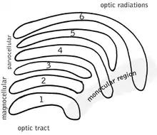 The lateral geniculate nucleus (LGN) is a sensory relay nucleus in the thalamus of the brain. The LGN consists of six layers in humans and other primates starting from catarrhines, including cercopithecidae and apes. Layers 1, 4, and 6 correspond to information from the contralateral (crossed) fibers of the nasal retina (temporal visual field); layers 2, 3, and 5 correspond to information from the ipsilateral (uncrossed) fibers of the temporal retina (nasal visual field). Layer one contains M cells, which correspond to the M (magnocellular) cells of the optic nerve of the opposite eye and are concerned with depth or motion. Layers four and six of the LGN also connect to the opposite eye, but to the P cells (color and edges) of the optic nerve. By contrast, layers two, three and five of the LGN connect to the M cells and P (parvocellular) cells of the optic nerve for the same side of the brain as its respective LGN. Spread out, the six layers of the LGN are the area of a credit card and about three times its thickness. The LGN is rolled up into two ellipsoids about the size and shape of two small birds' eggs. In between the six layers are smaller cells that receive information from the K cells (color) in the retina. The neurons of the LGN then relay the visual image to the primary visual cortex (V1) which is located at the back of the brain (posterior end) in the occipital lobe in and close to the calcarine sulcus. The LGN is not just a simple relay station, but it is also a center for processing; it receives reciprocal input from the cortical and subcortical layers and reciprocal innervation from the visual cortex.[27]