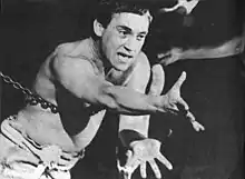 In 1964 Vysotsky auditioned at the Taganka Theatre. Yuri Lyubimov, the theatre's director, recalled the audition many years later: "A young man came to my theatre. When I asked him what role he wanted to read for, he answered, 'I've written some songs of my own. Won't you listen?' I agreed to listen to one song […] Our meeting should have lasted at most five minutes. But I ended up listening without interruption for an hour and a half."[22] Vysotsky was invited to join, and on 19 September 1964 he debuted in Bertolt Brecht's The Good Person of Szechwan as the Second God.[lower-alpha 3] Later that year he appeared on stage as a dragoon captain (Bela's father) in an adaptation of A Hero of Our Time.[23]