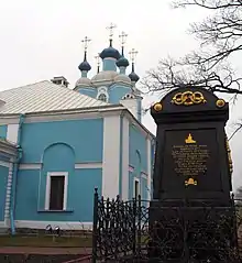 Vyborgski district has preserved a certain tangible memory of the nation's success in the Great Northern War. The day of the decisive Battle of Poltava in the south (in what is now Ukraine), on which Russians had their first major success in the war, fell on the feast day of Saint Sampson the Hospitable[4] (June 27, 1709), and a grand cathedral in his honour was built on the road to Vyborg. Completed during the reign of Anna of Russia, Sampsoniyevskiy Sobor (Saint Sampson's Cathedral) is now a museum - a branch of the ring of four museum churches with the head office at Saint Isaac's Cathedral.[5] Saint Sampson's Cathedral features among the few church buildings preserved from the first half of the 18th century - from the city's first decades of existence.[6] It replaced an earlier wooden church, whose construction started in 1709 on the Tsar's order, and which was consecrated the following year. The cathedral is interesting architecturally for its admixture of Old Russian forms with then-current elements of Western European trends, forming together "Anna's baroque" and is also known for its unique carved wooden iconostasis from that time.[6] For the bicentennial of the Battle of Poltava the ground floor of the bell tower was decorated by memorial plaques citing Peter's selfless encouraging words to his army on the day.[6] Opposite the building was placed Peter the Great's statue by Mark Antokolsky, taken away under Soviet rule years and restored on its place in the early 21st century.