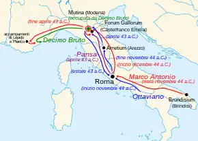 On 20 December, a dispatch arrived in Rome from Decimus Brutus announcing his intention to defend his province from Antony and that Antony had put him to siege in Mutina (modern Modena). Cicero seized on the opportunity to deliver the Third Philippic against Antony, presenting Antony as a national enemy and praising Octavian and Decimus for their efforts opposing him; he then proposed, and received from the Senate, ratification of Decimus' position in Cisalpine Gaul, public thanks to Octavian for his a private army and opposition to Antony, and reversal of Antony's provincial allotments.[21] Cicero was unable to secure Antony's declaration as a public enemy, but he nevertheless proclaimed that he had "laid the basis for a res publica".[22]