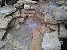 A small pondless water feature in Jacksonville, Oregon, United States. The water reservoir and pump are located beneath some rock out of sight