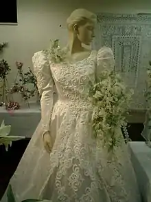 The first documented instance of a princess who wore a white wedding dress for a royal wedding ceremony is that of Philippa of England, who wore a tunic with a cloak in white silk bordered with squirrel and ermine in 1406, when she married Eric of Pomerania.[1][2] Mary, Queen of Scots, wore a white wedding dress in 1559 when she married her first husband, Francis, the Dauphin of France, because it was her favorite color, although white was then the color of mourning for French queens.[3][4]