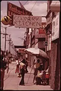 Puerto Ricans displaced by gentrification and city-backed urban renewal projects in Lincoln Park began moving to West Town and Humboldt Park by the thousands during the mid-late 1960s.[44][45] In 1960, West Town had a Latino population of 1%. By 1970, that number had grown to 39%.[46] Polish residents, who remained less upwardly mobile than the West Side's former German and Russian Jewish immigrants, remained in relatively large numbers in West Town centered around Catholic parishes. Humboldt Park began to see larger influxes of Puerto Ricans as the 1960s ended. In 1966, the first major urban Puerto Rican rebellion in the U.S. happened on Division Street, an event later known as the Division Street Riots[47] As the 1970s began, Humboldt Park suffered from poverty, crime, and gangs, leading to another uprising in 1977. To combat this, Puerto Rican community members across the West Side created social service organizations such as the Latin American Defense Organization (LADO) and the Segundo Ruiz Belvis Cultural Center.[48] The Young Lords, a former street turf gang from Lincoln Park, turned into a human liberation group, becoming warriors for the community by fighting further displacement and holding sit-ins at the Wicker Park Welfare Office and takeovers of institutions to implement free breakfast programs similar to the Black Panther Party.[49] In Pilsen, Mexican-Americans and Chicanos reclaimed the area as La Diesiocho because of the 18th Street business corridor. Pilsen became a large center for mural painting by those part of the Chicano movement and for those attempting to shift the view of Pilsen as a dangerous community.[50] La Villita, the neighborhood to the west of Pilsen and Heart of Chicago was being populated by even more Mexican-Americans, and the business corridor along 26th Street became the busiest after the Loop.[51]